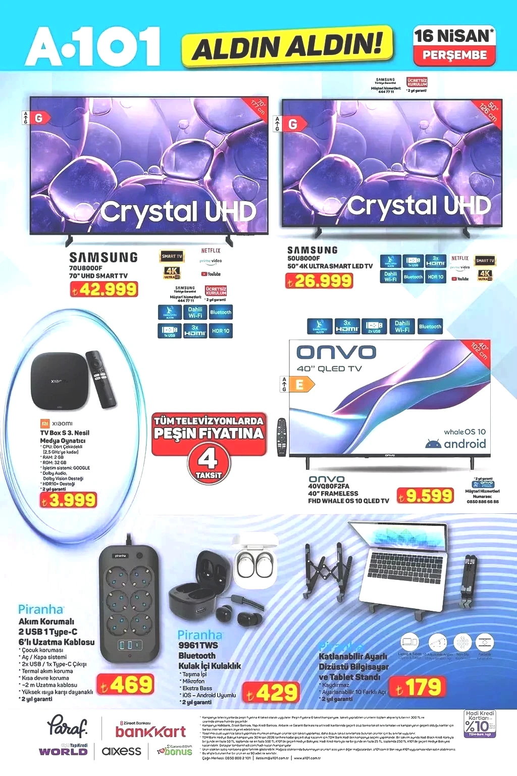 A101'in 16 Nisan aktüel kataloğunda TV, beyaz eşyalar, elektrikli aletler, kamp ekipmanları ve oyuncaklar için ilgi çekici fiyatlar sunuluyor.