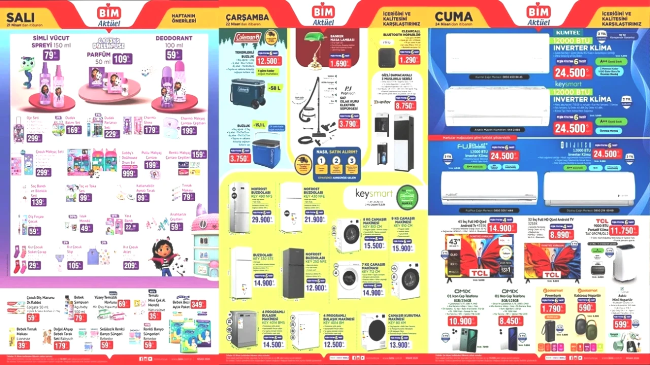 BİM, 21-22-24 Nisan 2026 tarihlerinde sunacağı yeni ürün kataloğu ile milyonlarca kişinin dikkatini çekmeyi başardı. Ülke genelinde geniş bir şube ağı bulunan bu popüler market zinciri, cazip fiyatlı klima, otomatik çadır ve damacanalı sebil gibi ürünleri raflarına eklemeye hazırlanıyor. Her gün ziyaret edilen marketlerden biri olan BİM’in kampanya kapsamındaki ürünlerin fiyatları belli oldu. İşte BİM'in 21-22-24 Nisan 2026 tarihli aktüel ürünler kataloğuna dair bilgiler..