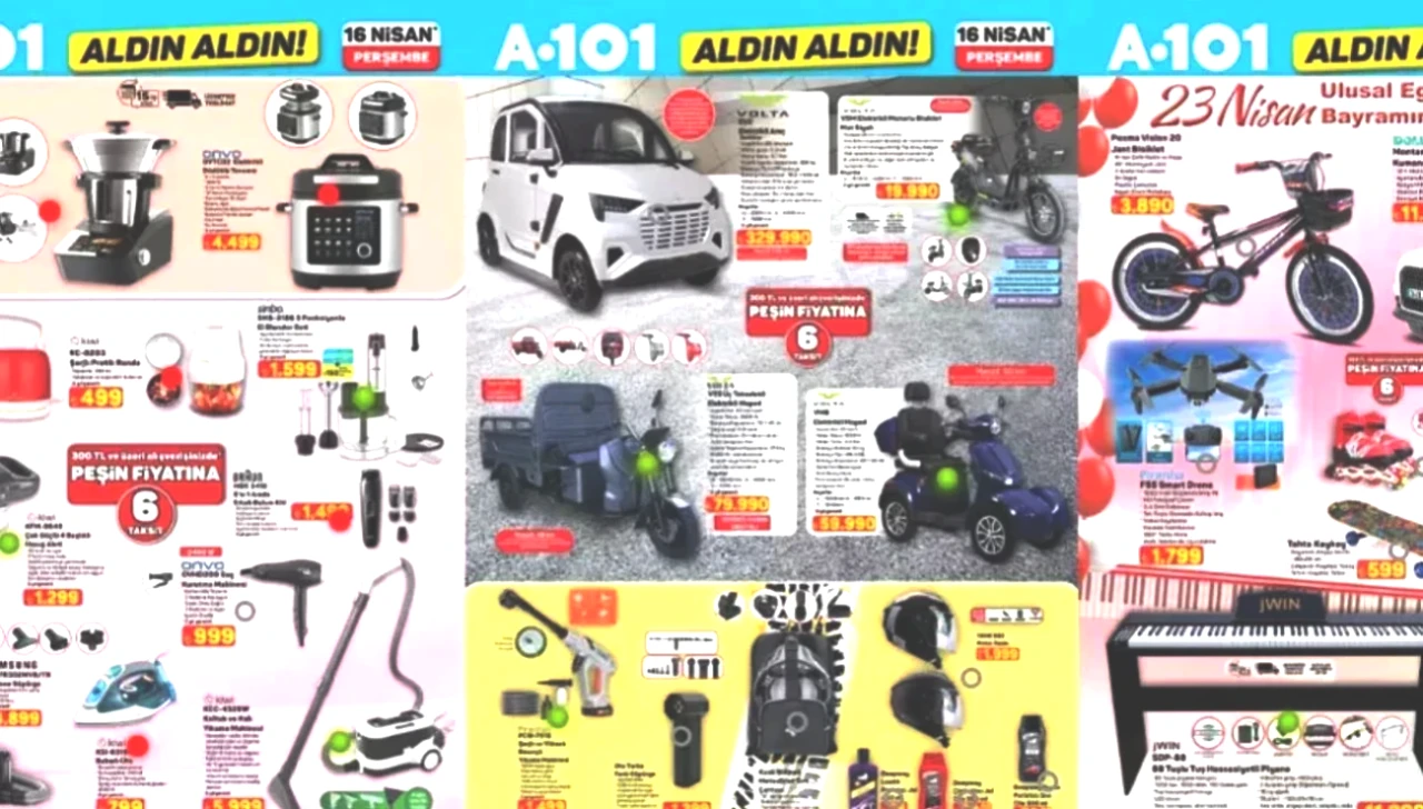 A101'de bu hafta "Aldın Aldın" kampanyası başlıyor! 16 Nisan Perşembe tarihinden itibaren geçerli aktüel katalogda, televizyonlardan kamp malzemelerine, beyaz eşyadan 23 Nisan'a özel oyuncaklara kadar pek çok ürün indirimli fiyatlarla raflarda olacak. İşte bu haftanın en dikkat çeken fırsatları!