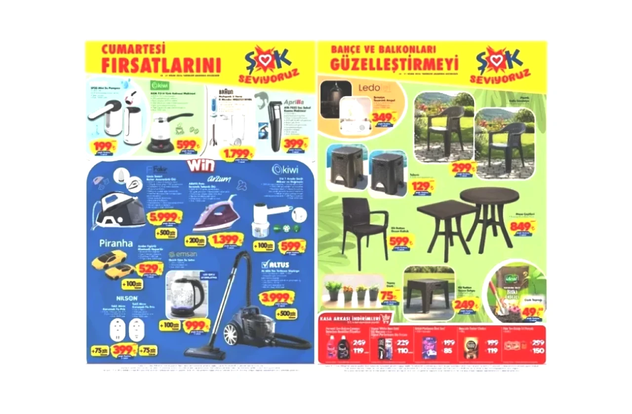 Şok market, 18-21 Nisan 2026 tarihleri arasında sunacağı geniş kapsamlı yeni kataloğuyla alışveriş keyfini artırıyor. Ev teknolojilerinden bahçe düzenlemesine kadar pek çok ürünün yer aldığı katalogda, mutfakta Braun el blenderı, Kiwi kahve makinesi ve şık bir Emsan cam kettle gibi pratik yardımcılar dikkat çekiyor. Temizlik ve bakım kategorisinde ise; Altus toz torbasız süpürge, Fakir buhar jeneratörlü ütü ve Aprilla saç sakal kesme makinesi ön plana çıkıyor. Bahar mevsimiyle birlikte bahçe ve balkonlarını yenileyenler için rattan desenli koltuklar, masalar, tabureler ve bitki toprağı gibi ürünler oldukça cazip fiyatlarla raflarda yer alıyor.